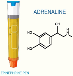 Vse osebe imajo po anafilaktični reakciji predpisana 2 samoinjektorja adrenalina (EpiPen), ki jih morajo ves čas nositi s sabo. EpiPen obstaja v dveh velikostih (150 mcg in 300 mcg), pravo koncentracijo predpiše zdravnik, glede na težo osebe. Adrenalin se s pomočjo samoinjektorja (peresnika z iglo) ob anafilaktični reakciji vbrizga v zunanjo zgornjo stran stegna v mišico. V kolikor je bila prva aplikacija zdravila neuspešna, aplikacijo ponovimo. Prav tako ponovimo aplikacijo adrenalina po 5 minutah v drugo stegno, v kolikor se anafilaktična reakcija po prvem dajanju zdravila ni prekinila. Ravno iz teh razlogov ima vsak predpisan 2 EpiPena. Osebe morajo redno preverjati rok uporabe zdravila.